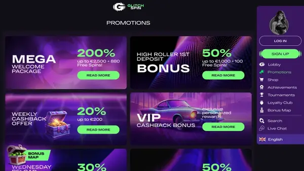 Etter velkomstpakken kjÞrer vi tre hovedkampanjer for Norge i NOK. Wednesday Reload tilbyr 30 % opptil 2 500 NOK, og Weekend Reload gÄr fra fredag til sÞndag med 50 % opptil 2 500 NOK. For spillere som foretrekker jevn verdi, gir Weekly Cashback 10 % tilbake pÄ netto tap opptil 2 000 NOK. Hver GlitchSpin-bonus har sine egne kriterier og kan endres basert pÄ kontostatusen din og tilgjengelige kampanjer.